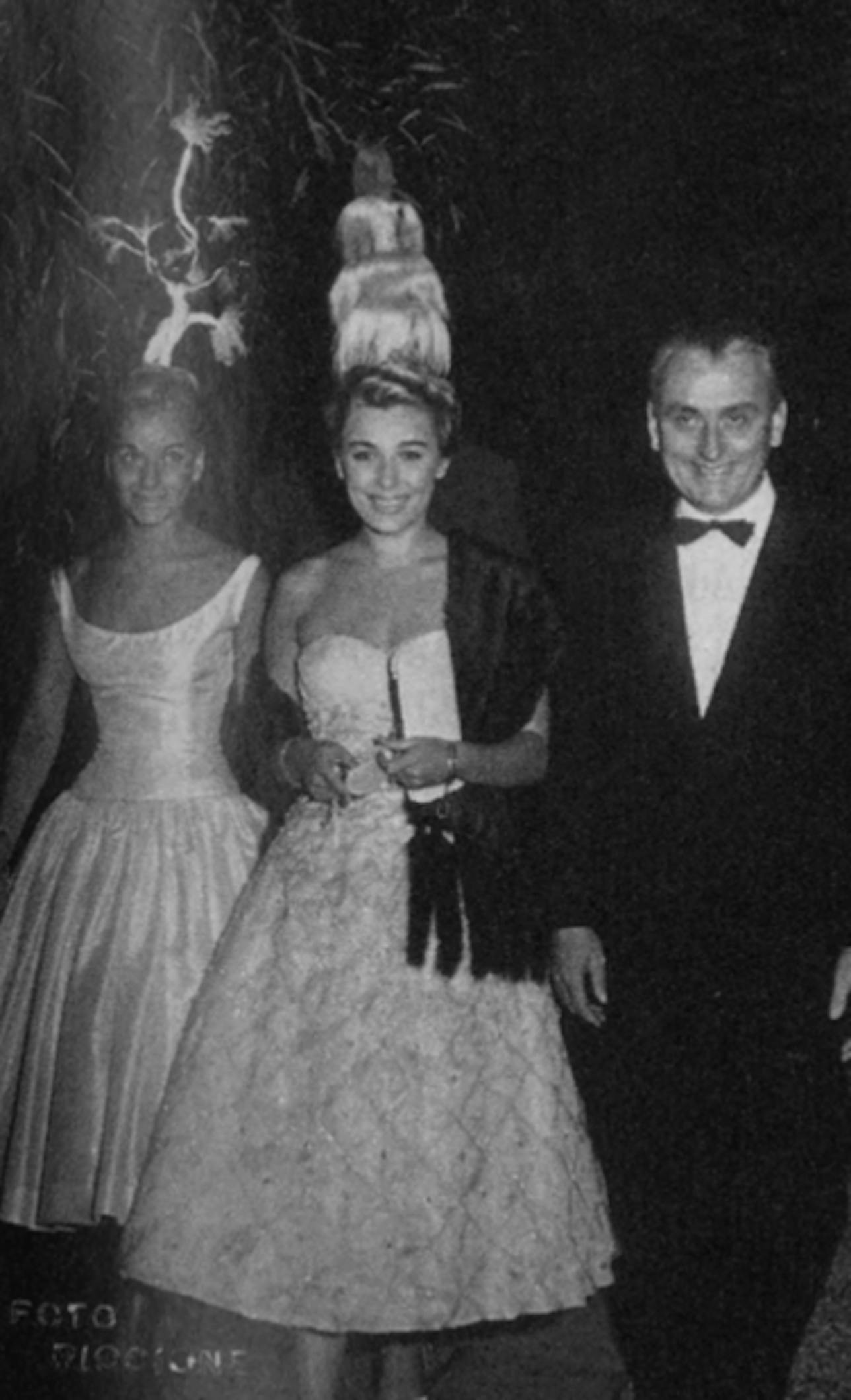 Nella pagina a fianco, Edy Campagnoli, famosa Valletta di "Lascia o raddoppia?", accanto a Bepi Savioli, con un'acconciatura per il concorso "Grand Bal-en-Tete".